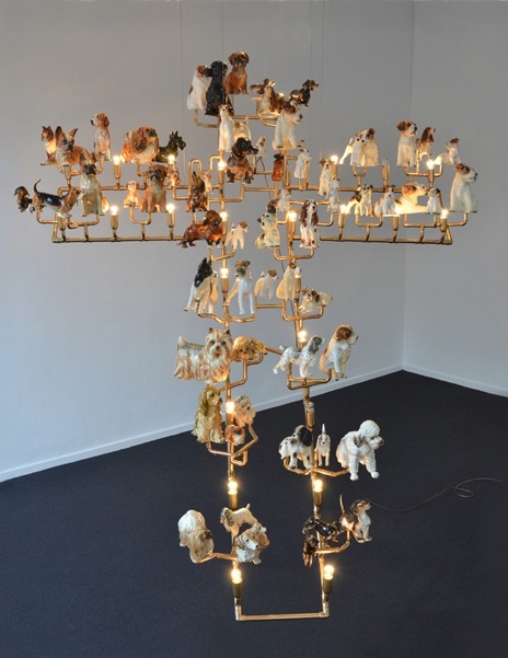 De oude beeldjes, gebruikt in dit werk, waren vroeger modieuze stukken door de consument in huis gehaald om de vensterbank, bijzettafel en schouw te versieren. Tegenwoordig worden deze beeldjes massaal weggedaan. Slechts ouderen houden vast aan het nostalgisch beeld. Bij overlijden of verhuizing naar een verzorgingshuis worden deze beeldjes via kringloopwinkels en door handelaren op rommelmarkten verkocht. Duurzaamheid door hergebruik is door de invloed van de massa en media propaganda een centrale rol gaan spelen in mijn werk. De nostalgie van de porseleinen beeldjes in een verlichtende ambiance zorgt voor een nieuwe plaats van dit oude goed in westerse interieurs. De beeldjes zijn verbonden via een frame met een chromen laklaag. Een symbolisch frame, met een sterke gevoelige lading, overspoeld door een kitscherige massaliteit.