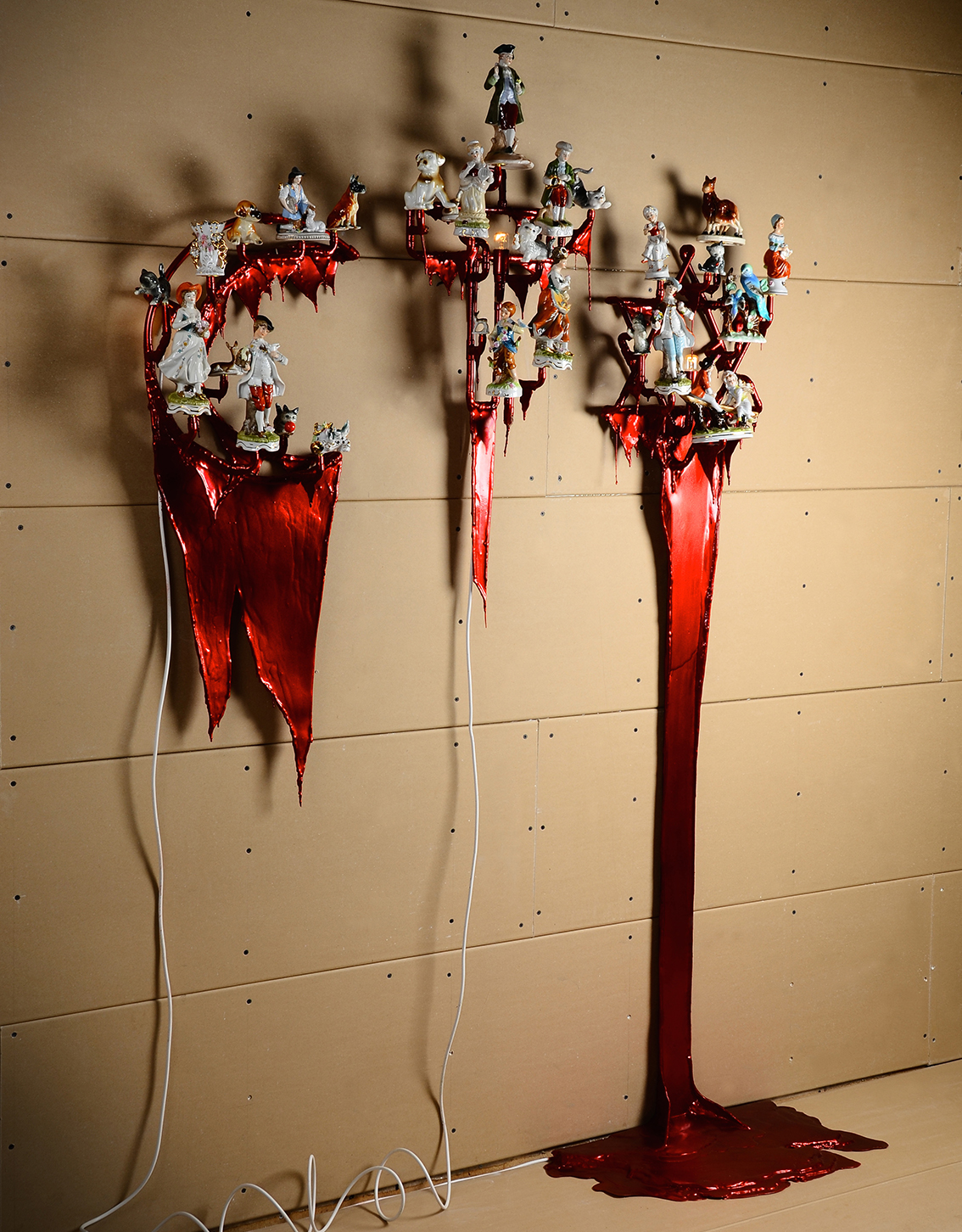 In continuation to Recycled Symbols, the first pieces belonging to the series Recycled Waste also consist of a symbolic frame loaded with nostalgic porcelain figurines. In contrast, usage of other materials and colours to accentuate its frame results in a different sense of decadence; instead of a chrome golden layer reflecting a sweet and valuable sense of decadence, by using a black tarry layer with the formation of little drops, as a direct reflection of our need for excessive consumption, a morbid sense of decadence is established. The porcelain figurines are connected to the frame with the same black tarry substance. However, the massive constellation of porcelain figurines resists this frame’s swallowing character. In time, the symbolic frame is replaced by a pile of waste, which is derived from Segall’s own consumption. The blood-red immersed artist’s waste reinforces the nostalgic image of a small white porcelain sculpture. And so a new destination is found for those old-fashioned figurines. Or will it eventually become part of our waste?